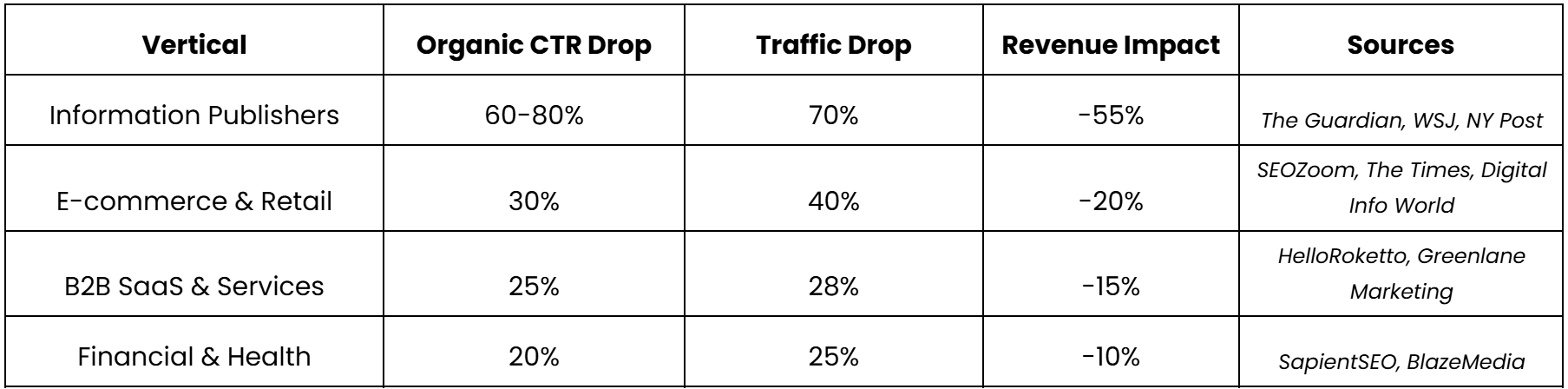Last year, Gartner predicted that brands will lose up to 50% of their organic traffic and associated revenue by 2028. However, the material impact is already being felt much faster, with a handful of verticals being hit the hardest: